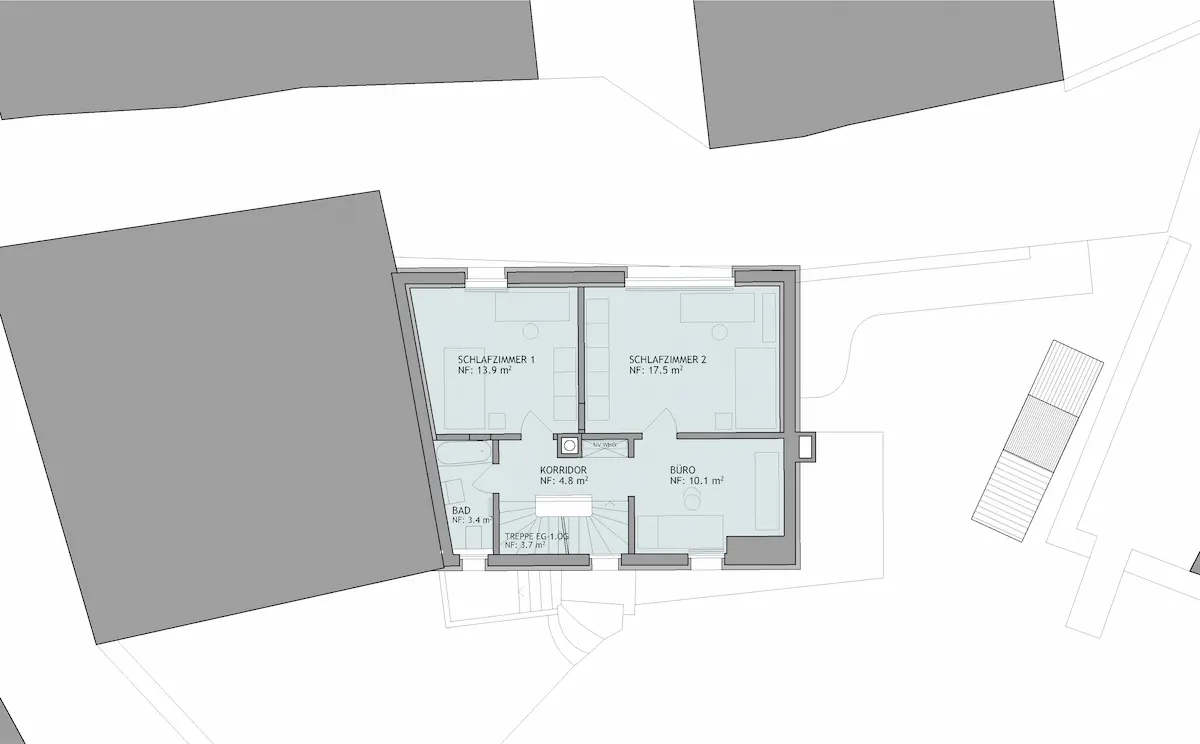 Wohngeschoss, offene Küche mit Wohnzimmer, 1 Schlafzimmer, Nasszelle mit Dusche